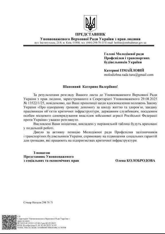 Молодіжна рада профспілки залізничників і транспортних будівельників України бере участь у фаховому обговоренні питань соціального захисту працівників критичної інфраструктури, які постраждали внаслідок збройної агресії російської федерації, у межах роботи Тимчасової спеціальної комісії Верховної Ради України.
